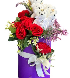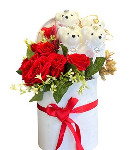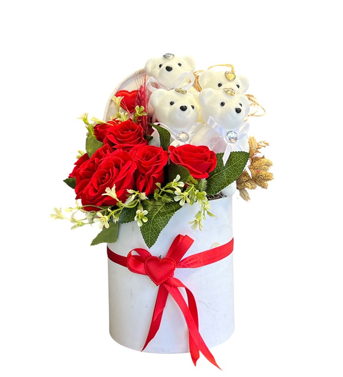 Altın silindir kutu içerisinde özenle tasarlanmış yapay kırmızı güller ve sevimli şık ayıcık detayları, duygularınızı en zarif şekilde ifade etmenizi sağlar. Göz alıcı altın kutu tasarımı, hem romantik hem de dekoratif bir hediye seçeneği sunarken; solmayan yapay güller sayesinde bu özel anı uzun yıllar saklanabilir. 💛