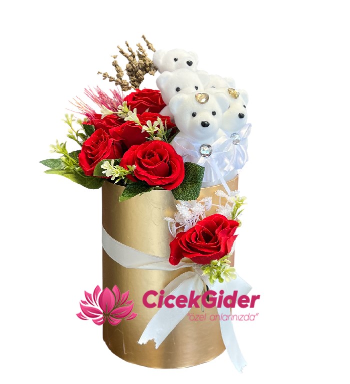 Altın Kutuda Yapay Kırmızı Gül & Ayıcık – Çiçek Gider