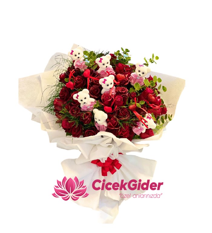 Canlı kırmızı güllerin ihtişamı, sevimli peluş ayıcıkların sıcaklığıyla birleşiyor; ortaya hem romantik hem de göz kamaştırıcı bir hediye çıkıyor. Gösterişli yapısı ve yoğun gül dokusu sayesinde ilk bakışta hayranlık uyandırır.
