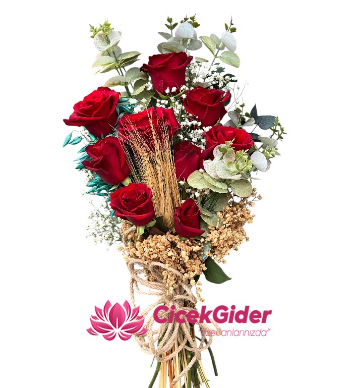 Aşkı en saf ve en doğal haliyle ifade etmek isteyenler için özel olarak tasarlanan Doğal Dokunuş 9 Kırmızı Gül Buketi, klasik romantizmi modern rustik detaylarla buluşturuyor. Özenle seçilmiş 9 adet taze kırmızı gül, okaliptüs yaprakları, cipso çiçekleri ve doğal başak dokunuşuyla hazırlanarak hem şık hem de etkileyici bir görünüm sunar.