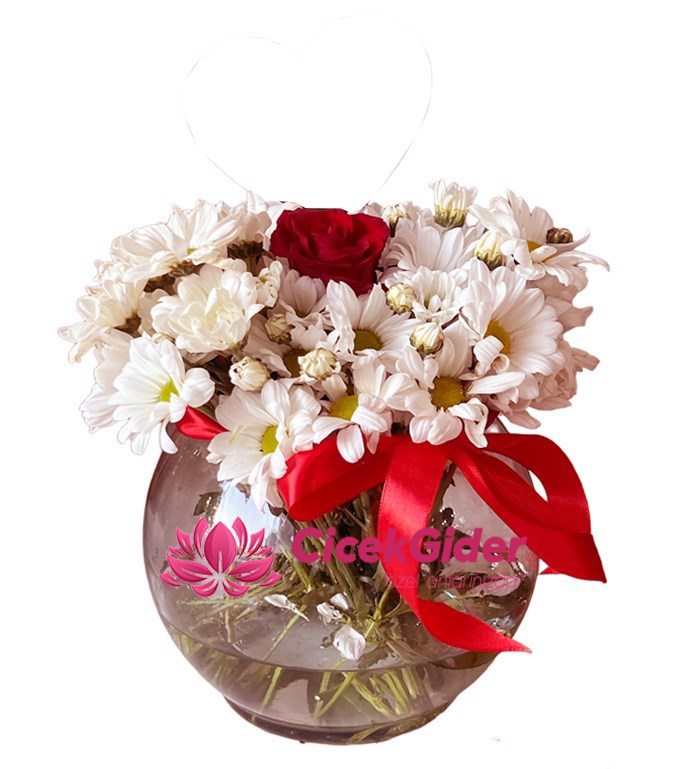 Göz alıcı bir kompozisyon olan bu çiçek aranjmanı, adeta bir ressamın tuvaline işlenmiş gibi, her bir çiçeğin dokusu ve rengiyle bir hikaye anlatır. Fanusun zarif kavanozunda yer alan beyaz papatyalar, saf ve masumiyetin sembolüdür. Bu beyaz güzellikler, sevgi dolu bir duygunun izlerini taşır.