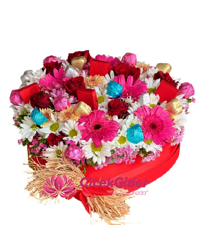 Bu özel tasarımda, aşkın simgesi kırmızı güller, neşenin temsilcisi pembe gerberalar ve masumiyetin sembolü beyaz papatyalar bir araya geliyor. Aranjman, şık kırmızı kutusu içinde sadece bir buket değil, aynı zamanda içerisinde saklı premium çikolatalarla bir hediye kutusu deneyimi sunuyor. Altın ve renkli folyolara sarılı çikolatalar, çiçeklerin tazeliğine tatlı bir dokunuş ekliyor.