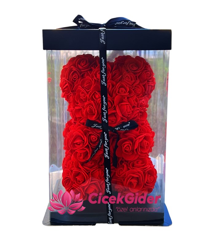 Çiçek Gider markasının en özel ve romantik tasarımlarından biri olan Kırmızı Güllü Ayıcık (Kutulu), sevdiklerinize duyduğunuz sonsuz aşkı ve tutkuyu ifade etmenin en şık yoludur. Yüzlerce canlı görünümlü, yüksek kaliteli yapay kırmızı gül ile el yapımı olarak özenle tasarlanan bu eşsiz Rose Bear, kalıcı bir hediye arayanların ilk tercihi.