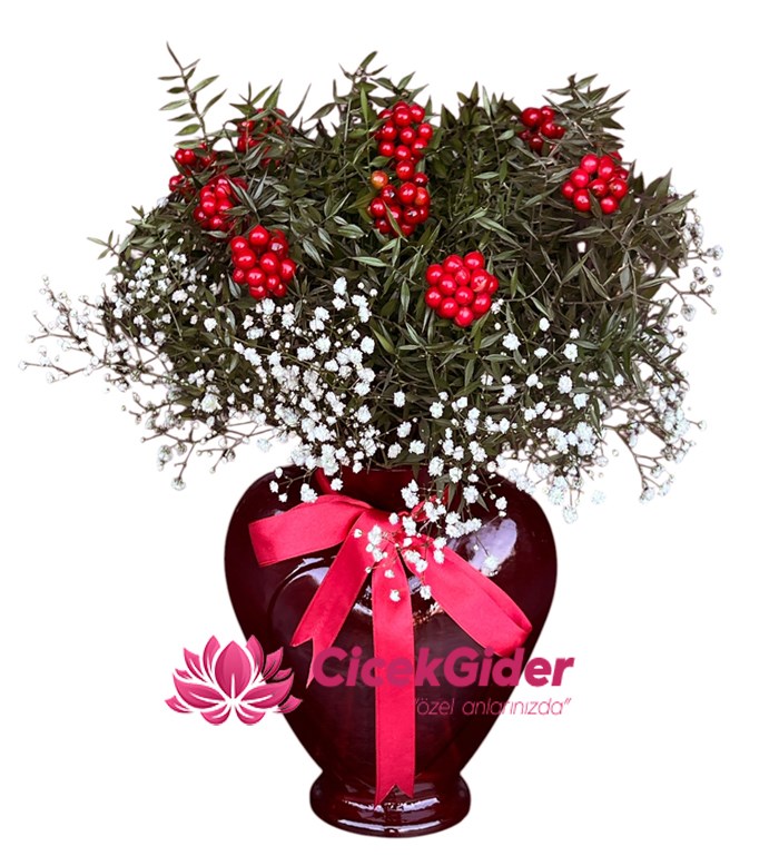 Yeni yılın ruhunu evinize taşımak, sevdiklerinize sıcacık bir yılbaşı mesajı göndermek için en güzel tercihlerden biri: kırmızı kalp cam vazo içinde yılbaşı kokinaları! Bu özel aranjman, yılbaşına özel olarak özenle hazırlanmış kokina çiçekleriyle hem zarafeti hem de aşkın simgesini bir araya getiriyor. Yılbaşının şans getiren çiçeği olarak bilinen kokina, kırmızı meyveleri ve yeşil yapraklarıyla doğanın ve kutlamaların enerjisini yansıtıyor.