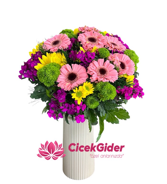 Çiçek Gider kalitesiyle özenle hazırlanan bu canlı çiçek aranjmanı, tazeliğini uzun süre koruyan seçkin çiçeklerden oluşur. Modern ve sade krem vazo tasarımı sayesinde ev, ofis ve tüm yaşam alanlarına uyum sağlayarak dekoratif bir şıklık kazandırır. Renklerin uyumlu dansını yansıtan bu aranjman; duygularınızı en doğal, en samimi ve en etkileyici şekilde ifade etmenize yardımcı olur.