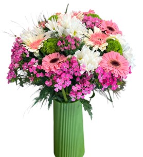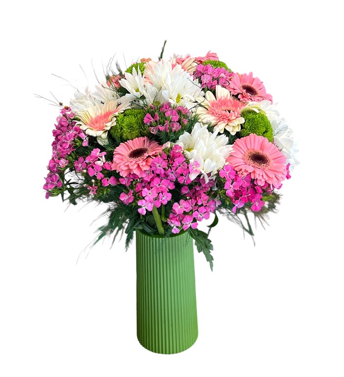 Krem Vazoda Canlı Çiçek Şöleni, doğanın en enerjik renklerini zarif bir tasarımla buluşturan özel bir çiçek aranjmanıdır. Pembe gerberaların romantik dokunuşu, sarı çiçeklerin neşeli ışıltısı ve yeşil tonların ferahlatıcı uyumu; krem çizgili şık vazo içerisinde göz alıcı bir bütünlük sunar. Sevdiklerinize mutluluk, umut ve pozitif enerji göndermenin en zarif yollarından biri olan bu özel tasarım, hem günlük sürprizler hem de doğum günü, yıl dönümü, teşekkür ve yeni iş kutlamaları gibi anlamlı anlar için mükemmel bir tercihtir.
