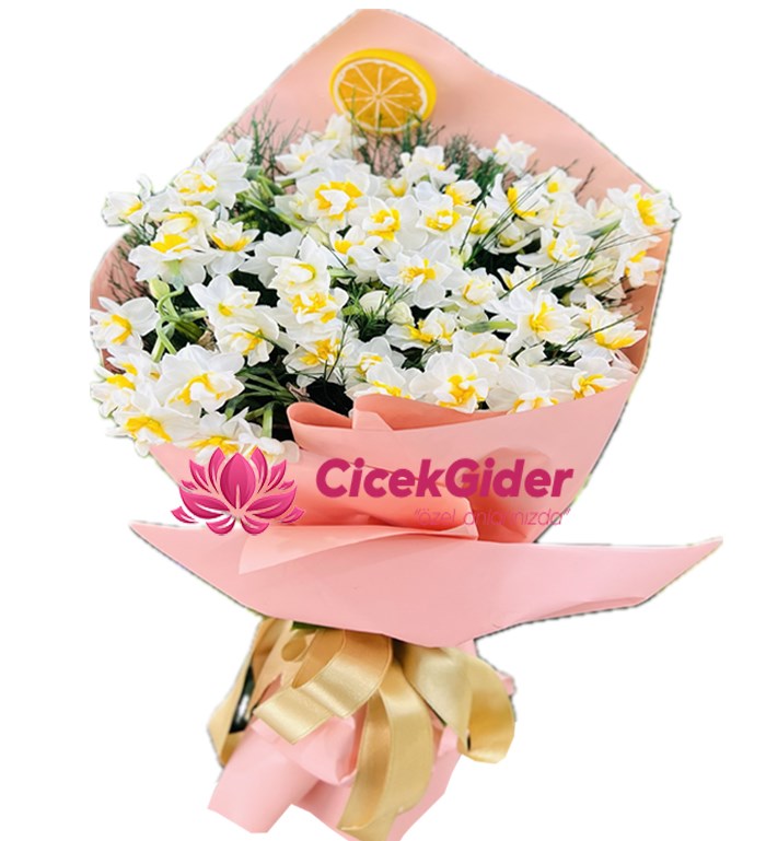 "Çiçek Gider"in en özel tasarımlarından biri olan Nergisli Günler Buketi, sadece bembeyaz ve mis kokulu nergisleri değil, aynı zamanda canlı pembe ambalajı, altın rengi kurdelesi ve üstündeki tazeleyici limon detayıyla (veya tematik aksesuarıyla) adeta bir bahar festivalini evinize taşıyor. Bu buket, neşeyi, pozitifliği ve yepyeni başlangıçların heyecanını temsil eder.
