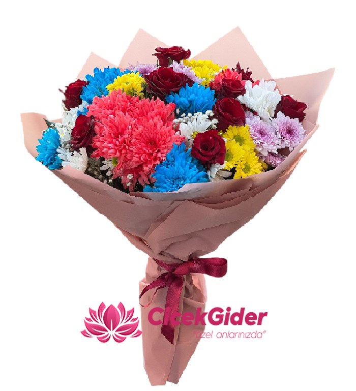 Mersin'in canlı, sıcak atmosferini ve Akdeniz'in tüm coşkusunu yansıtan bir buket: "Seninle Renkli Gül Bahçem". Kırmızı güllerin derin aşkı, mavi, sarı ve pembe krizantemlerin dinamik enerjisiyle buluşarak, Mersin'deki sevdiklerinize unutulmaz bir sürpriz yapmanız için tasarlandı.