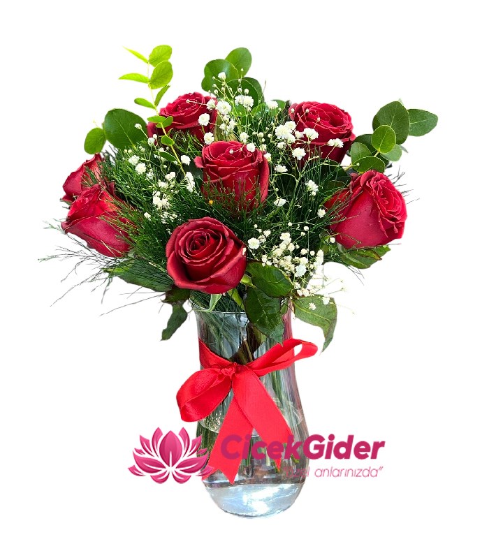 Bir romantik anı ölümsüzleştirin! 7 kırmızı gül, silindir vazoda şıklığınızı taçlandırır. ''Çiçek Gider'' ile sevgilinizi etkileyin. Aşkınızı taze çiçeklerle ifade edin!