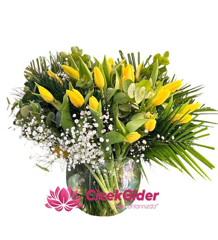 Özenle seçilmiş canlı sarı laleler, zarif beyaz cipso çiçekleri ve doğal yeşilliklerle bir araya getirilerek hazırlanır. Gün ışığını andıran rengiyle bulunduğu ortama anında sıcaklık katan bu aranjman; doğum günü, teşekkür, geçmiş olsun, yeni iş tebriği ya da sadece “seni düşündüm” demek için mükemmel bir tercihtir.