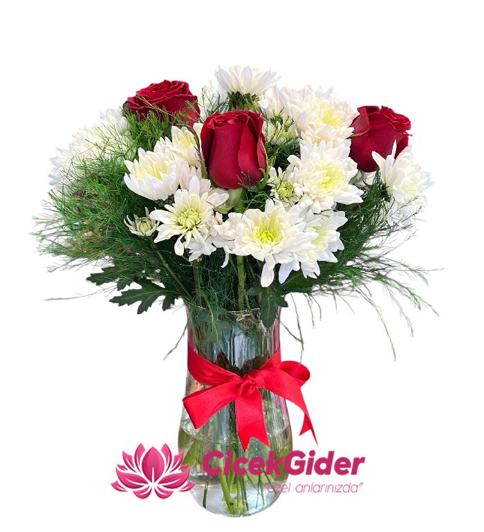 Silindir Şeffaf Cam Vazoda Beyaz Papatyalar ve Aşkın Simgesi Kırmızı Güller