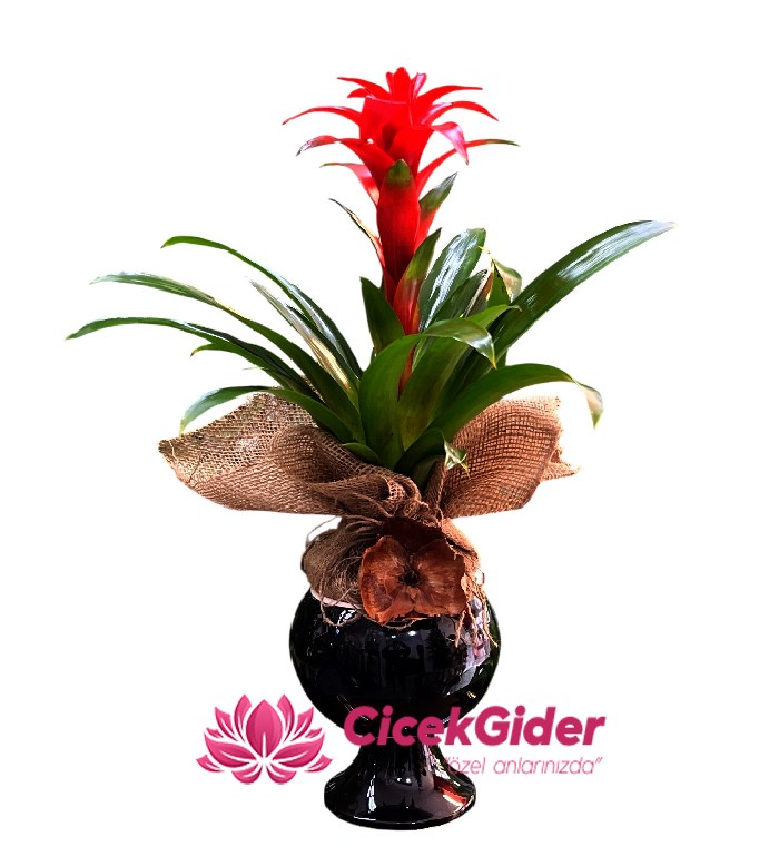 Canlı kırmızı guzmania çiçeği; parlak, sağlıklı yaprakları ve uzun ömürlü yapısıyla bulunduğu ortamda hemen fark edilir. Şık siyah seramik vazo ve doğal jüt detaylarıyla tamamlanan bu özel tasarım, hem klasik hem modern dekorasyonlara mükemmel uyum sağlar.