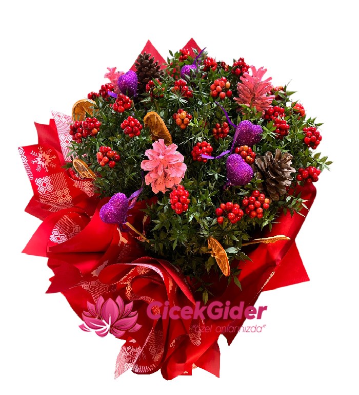 Canlı kırmızı taneleri, yeşil yapıları ve yılbaşı süslemeleriyle tamamlanan bu özel aranje; yeni yılın enerjisini, umut dolu mesajlarını ve hediye geleneğini tek bir bukette buluşturur. Kokina araması yapanların en çok tercih ettiği tasarımlar arasında olan bu buket, yılbaşı sofralarına, ofis masalarına ve kapı girişlerine ayrı bir atmosfer katar.